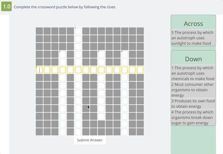 Crossword Puzzle Game (#142) asks students to complete an online crossword puzzle. Teachers can easily create their own clues and answers that align with standards and content that students are learning. This question type can be used across subjects and includes auto-grading.