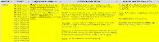 I’ve highlighted 4.NBT.B.5, as that is the standard to which this lesson in this example aligns. It is important to note that Module 3, Lesson 10 is one out of 18 lessons that lead students to master this standard. As I break down the standard into what students will need to KNOW and DO to demonstrate mastery, I must also determine where this lesson, in particular, builds toward their skill in doing so. I should not expect them to have mastered this entire standard by the end of my lesson on Monday, yet they should be one step closer toward demonstrating mastery and be able to do so by the end of that 18th lesson.